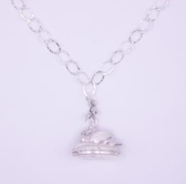 ‘everything has a crack in it’ , a seal fob pendant inspired by Conlon’s grandmothers costume jewellery with a contemporary take. The stones in the bottom of the pendant are cracked recalling the moment Oengus finally finds Caer Ibormeith in a swans form. Conlon describes this moment as “When the partition between worlds finally breaks.”