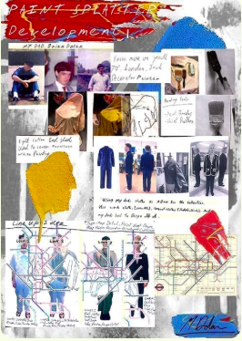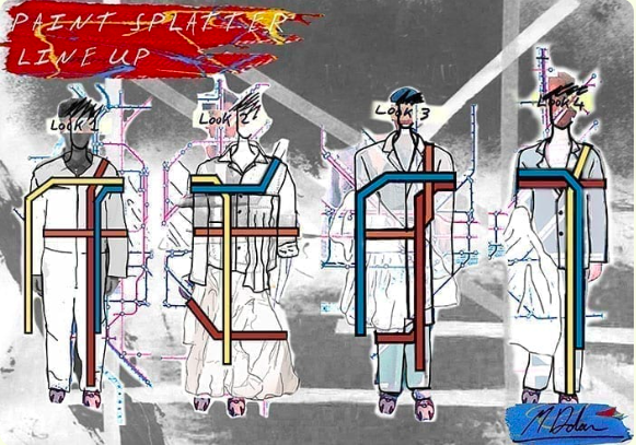 The collection was inspired by his father’s time in London in the 70s, working as a painter and decorator. Overalls created for the collection resembled the shape and cut of his father’s vintage workwear. “The whole collection is overlaid with the idea of a tube map and travelling back and forth across London,” painted designs over the pieces resemble an important element of London transport. “You have all these stripes of colours going across the collection. That’s all of the different tube lines.”