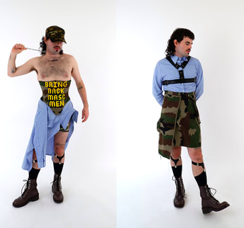 Martin Dolan is an Irish designer now based in London, who blends his personal history, irony and activism into his collections. From his first collection, “Paint Splatter”, inspired by his father’s 1970 workwear, invoking nostalgia, to his provocative “Bring Back Masculine Men,” which challenges traditional masculinity through modular, gender-fluid designs. Martin challenges convention with wit and purpose. His Keffiyeh dress for Gaza raised funds for charity, showing fashion’s power for social impact.