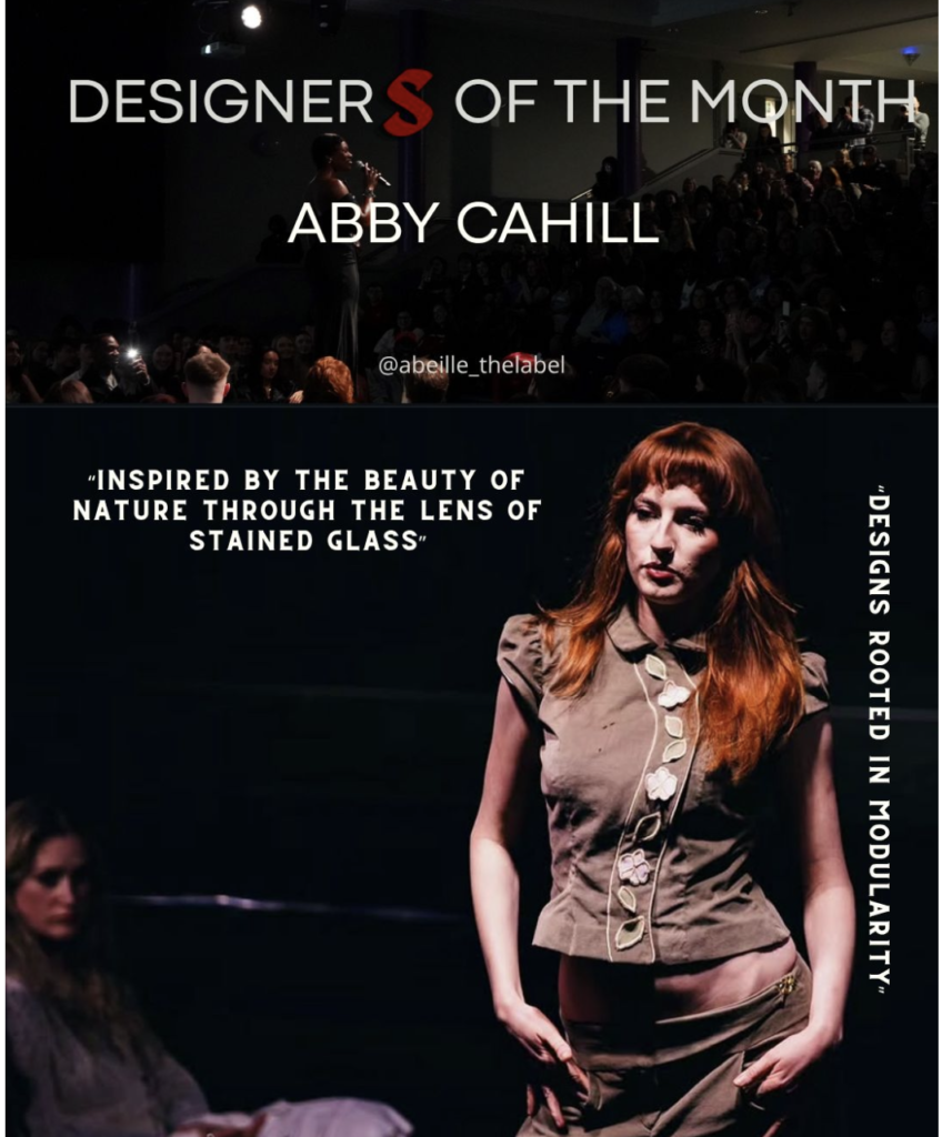 Abby is passionate about sustainable fashion, and after completing her engineering degree, she decided to pursue her dream. She is eager to take part in PYD to challenge herself both creatively and technically, and to develop her skills as a designer. Abby creates feminine clothing that encourages women to embrace dressing up in their everyday lives and to feel confident standing out. Her designs are rooted in modularity, allowing the wearer to style each piece in multiple ways. She strives for sustainability and to work exclusively with natural materials. For the show, she was inspired by the beauty of nature seen through the lens of stained glass. The look features convertible trousers, a fitted blouse, and a versatile overskirt that can also be worn as a bolero, designed to evoke the form of a stained-glass lamp.