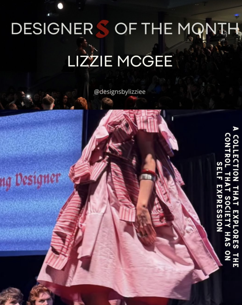 Lizzie is in her final year of Fashion Design at NCAD. Her work explores the idea that individuals are shaped and constrained by societal standards, much like a marionette controlled by a puppet master. This concept is embodied in one of the eight pieces within her collection, which reflects the theme of “Breaking the String” by encouraging the disruption of this cycle through self-discovery and fearless expression through clothing. Sustainability is central to Lizzie’s practice, who creates using deadstock, recycled fabrics, and off cuts of store-bought materials. By combining structured and organic silhouettes with vivid colours and bold prints, she invites the wearer to experience a sense of liberation and empowerment through self-expression.