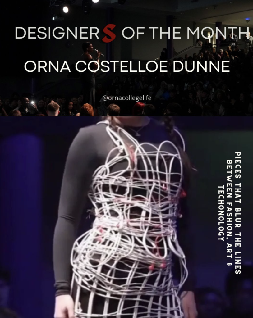 Orna is a recent Fashion and Textiles graduate from NCAD with an interest in work that blurs the boundaries between fashion, art, and technology. Her practice spans a wide range of experimental pieces that combine sculpture and garment design. She works extensively with found objects and repurposed materials, integrating bold printed CAD designs and digital media. Her piece explores the ways in which humans waste time on social media and their phones. Using discarded technological cables woven into a sculptural garment, the work reflects on our entanglement with digital devices and the influence of technology.