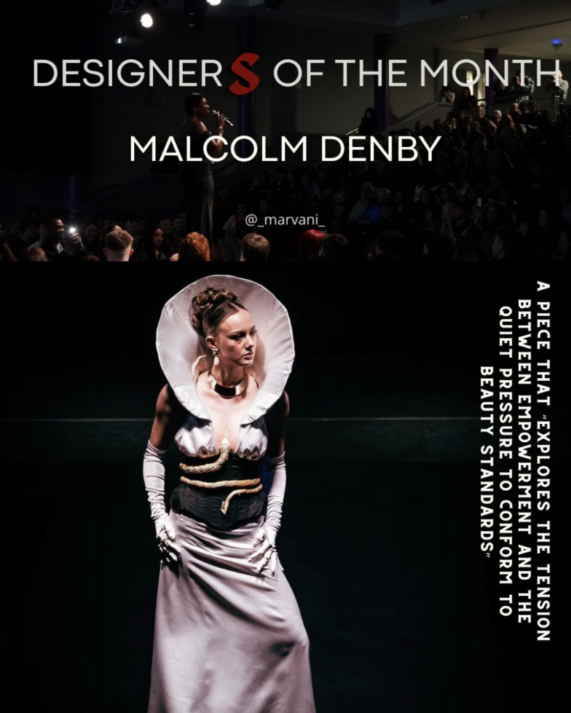 Malcolm Denby’s the Serpent explores the tension between empowerment through shaping the body and the quiet pressure to conform to unrealistic ideals. A white backless maxi dress with an exaggerated sculptural collar forms the foundation of this look. Over the dress sits a black under-bust corset with hip gores, wrapped tightly by a gold serpent. The white represents an idealised sense of purity and perfection, while the serpent symbolises the subtle, yet persistent pressure and restriction imposed by modern beauty standards, particularly the expectation of a controlled, cinched, and disciplined body.